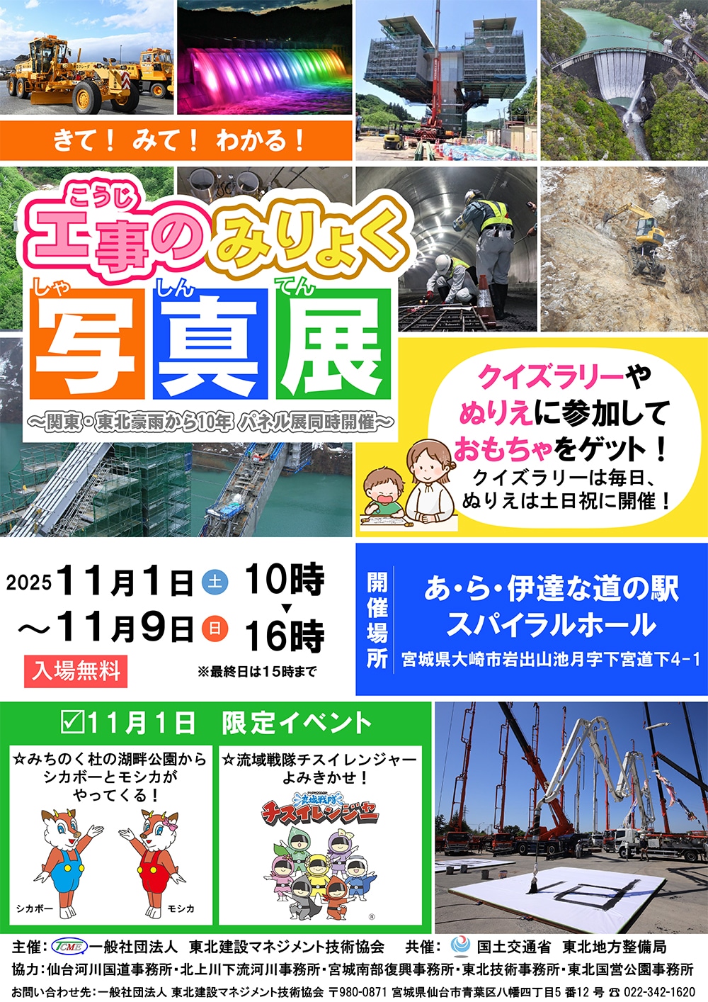 会場では「建設業の仕事内容の説明」や「災害の時、活躍する車や機械」を写真パネルで紹介。ふだん何気なく利用している橋やトンネルについて学ぶことができます。毎日開催されるクイズラリーのほか、土日祝には親子で楽しめる塗り絵コーナーも設置、1日(土)にはみちのく杜の湖畔公園のコラボイベントや紙芝居読み聞かせイベントも開催されます。ぜひこの機会に足をお運びください。